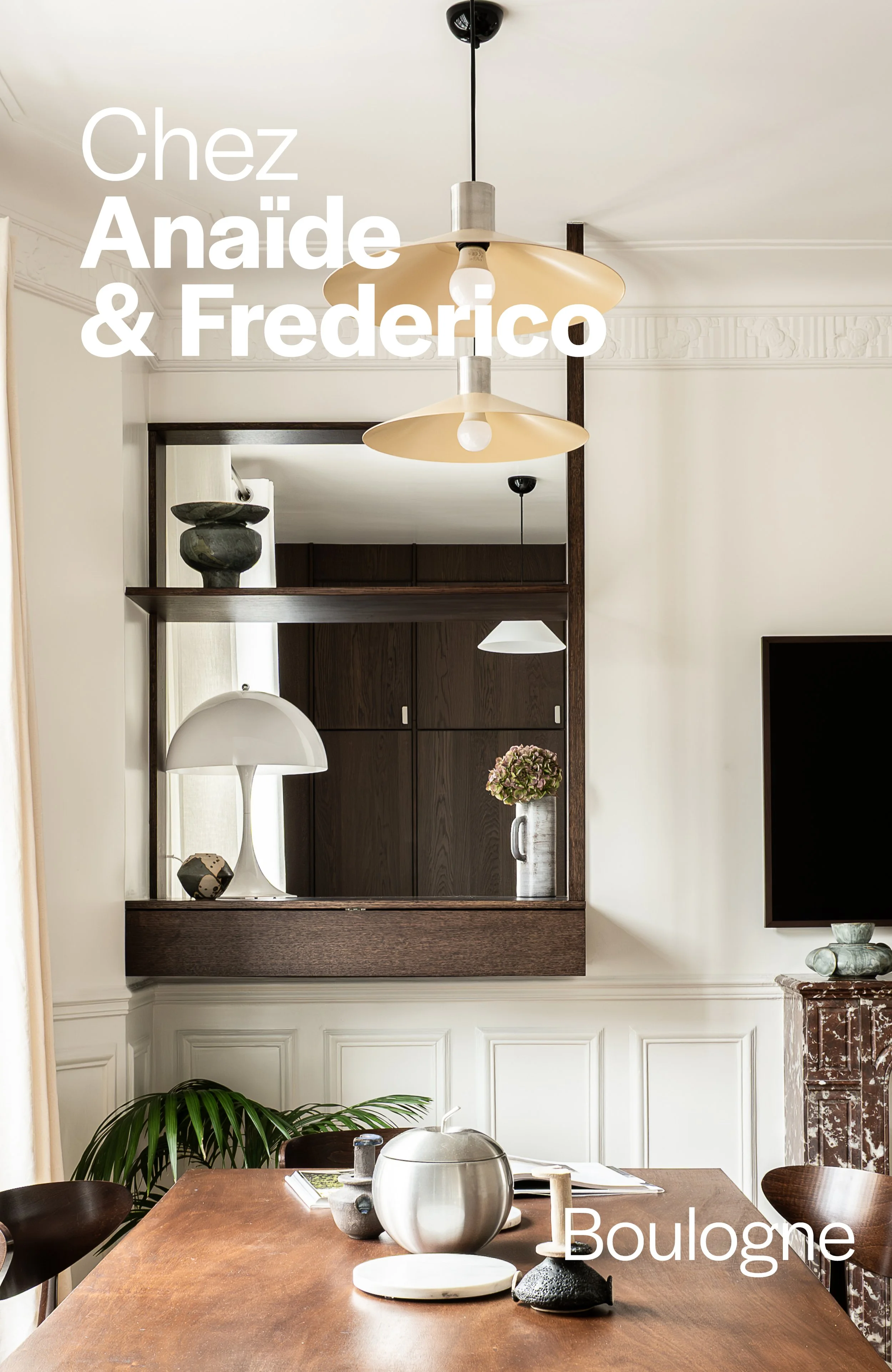 Intérieur d'une pièce avec un miroir, une suspension moderne au plafond, un vase avec des branches, et des vases décoratives, dans un style contemporain et chaleureux.